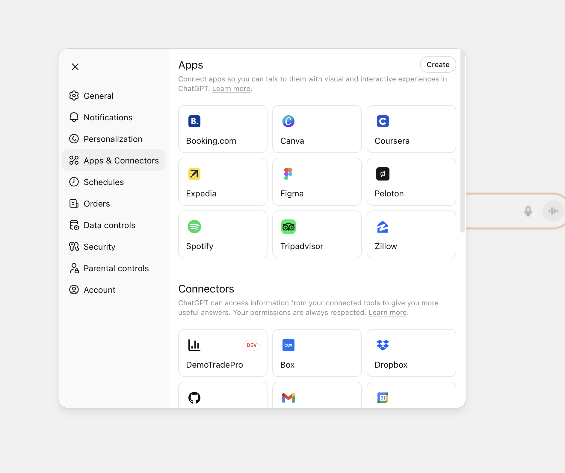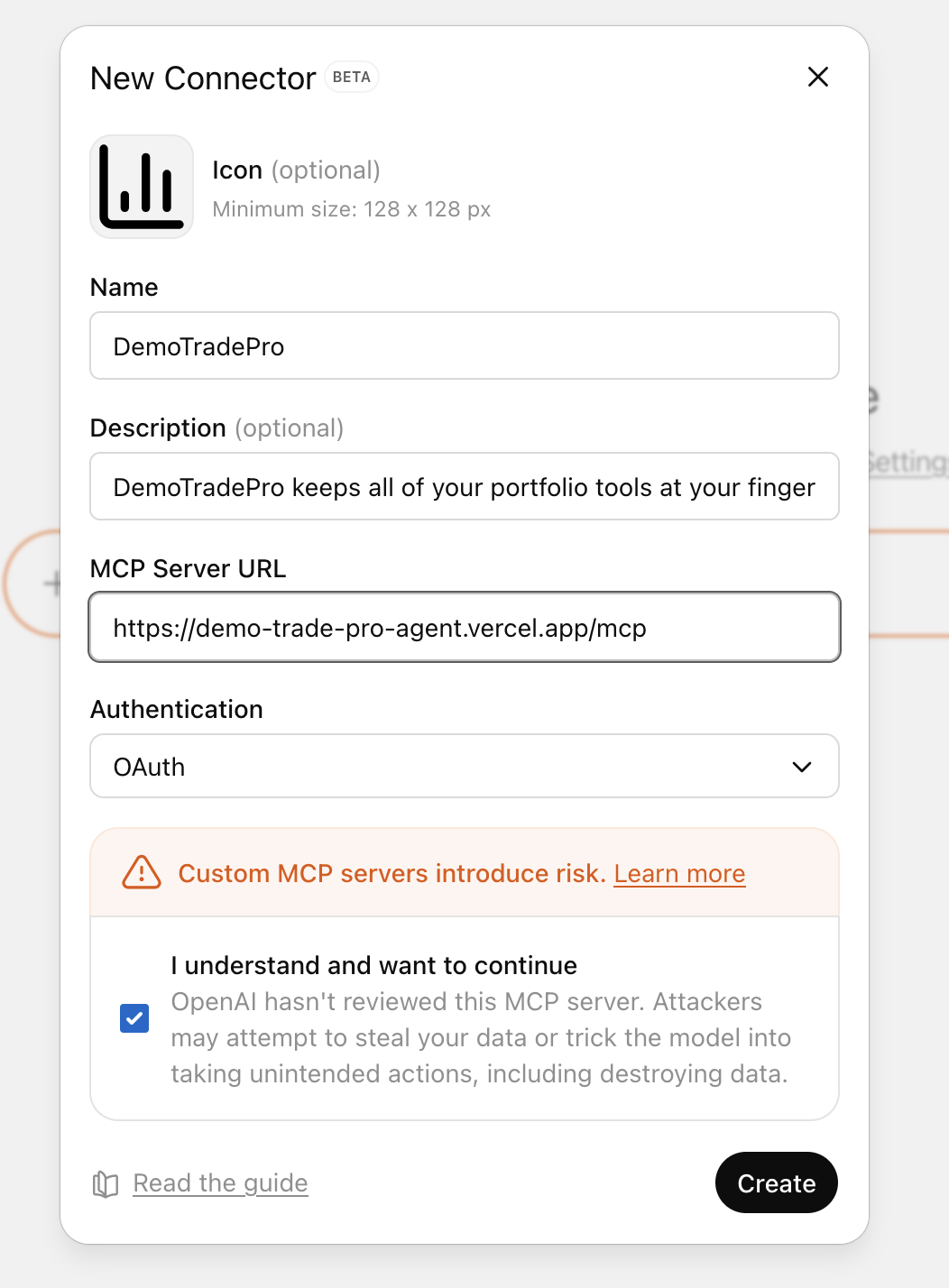 After you've enabled Developer Mode in your ChatGPT settings, you can create a new ChatGPT App Connector under your ChatGPT settings. Hit the Create button to get started: