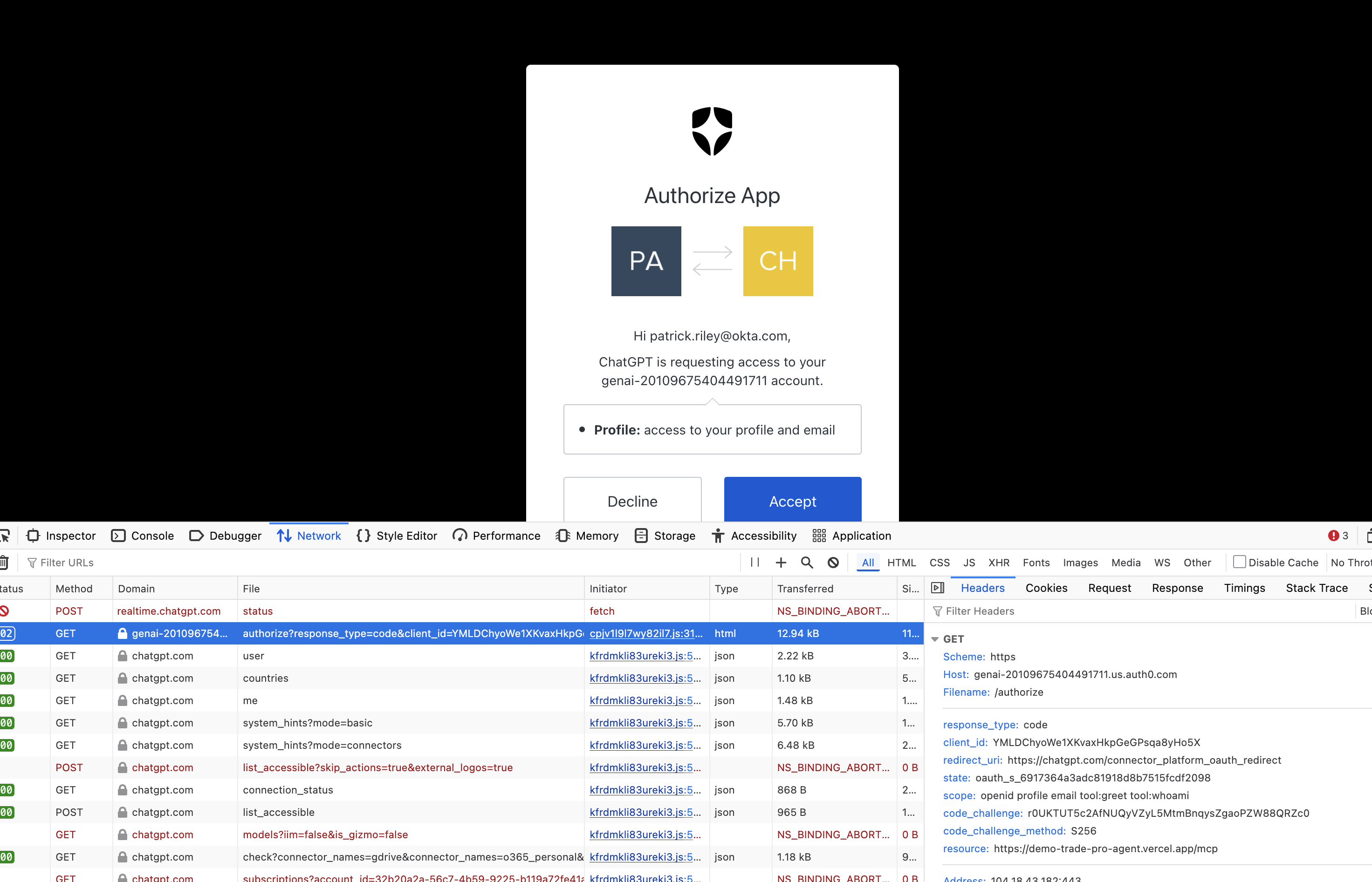 Now you should see you an Auth0 consent screen, asking you to authorize the ChatGPT App Connector to access your MCP Server resources on your behalf. This is where the OAuth DCR flow we implemented earlier comes into play. The resource is set to your MCP Server URL, and the connector uses DCR to register itself dynamically with your Auth0 tenant.