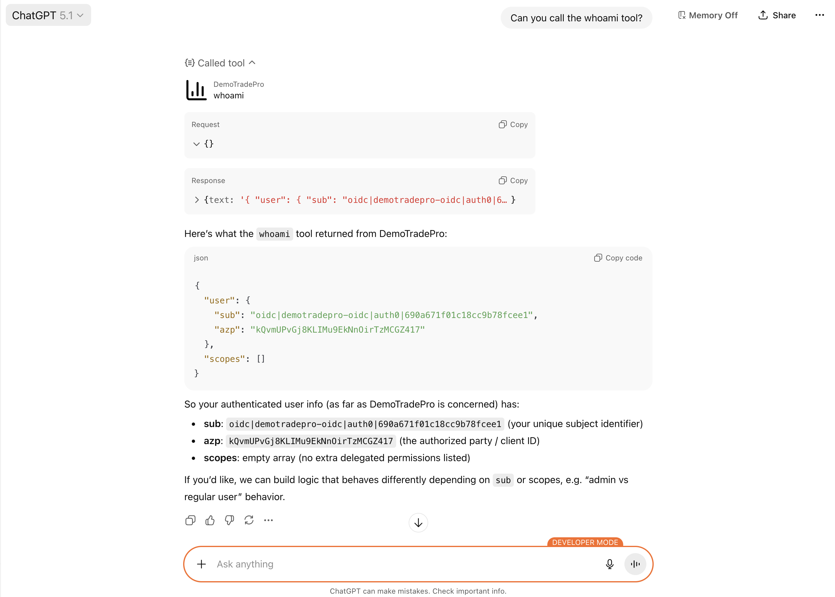 ⚠️ Also important: you'll need to set the AUTH0_AUDIENCE to the API Identifer you used when creating the StockTrade MCP Server API in Auth0. This is critical for token validation to work correctly. As you'll see later in the ChatGPT App SDK section, some providers will actually request this as the resource (audience) based on the MCP Server URL you provide and not allow you to specify it when authorizing with Auth0, so I recommend making this match your MCP resource URL exactly, e.g., https://demo-trade-pro-agent.vercel.app/mcp. This will require you to create an additional API in your Auth0 tenant with this exact identifier with matching settings to your existing StockTrade MCP Server.