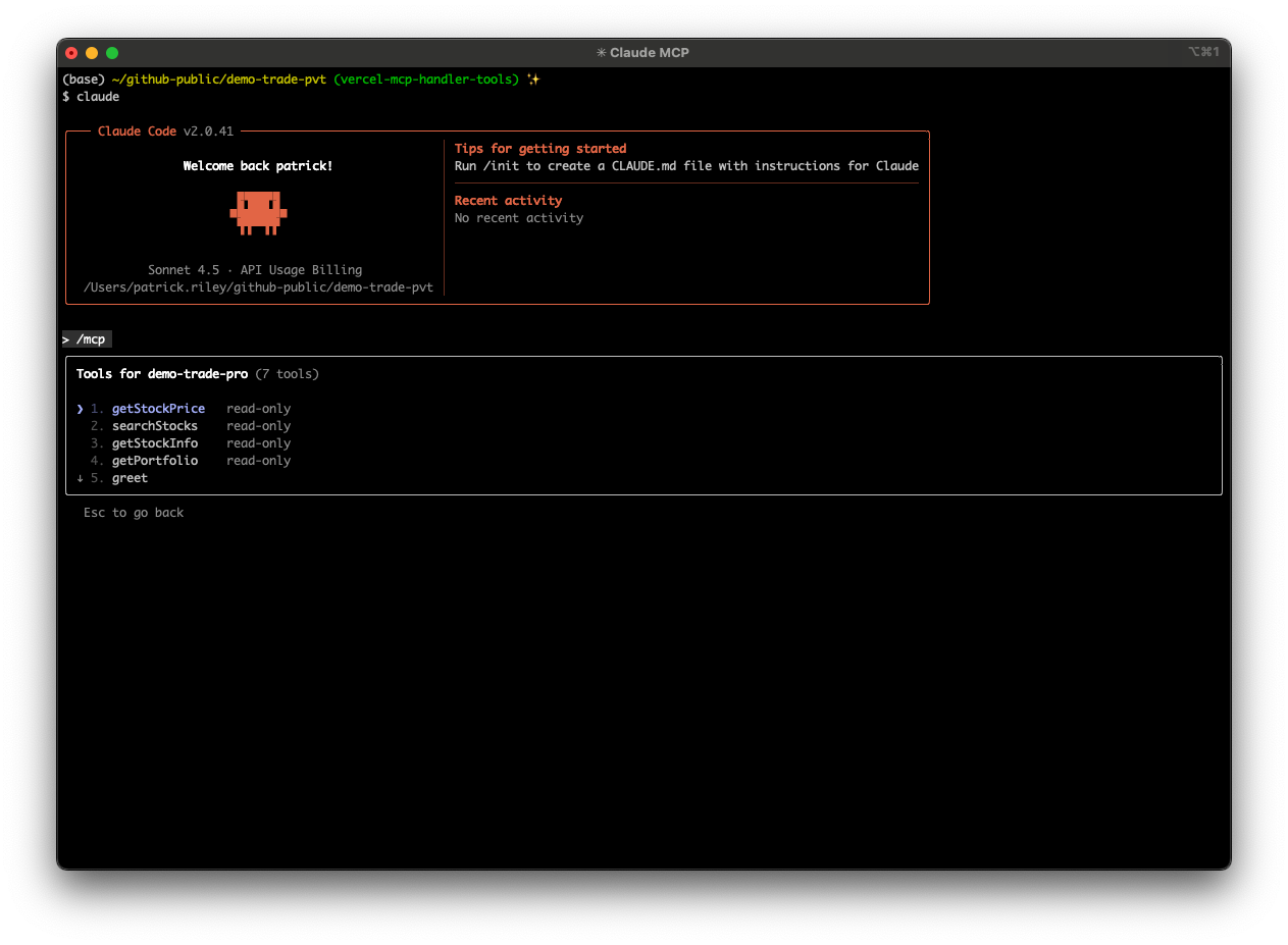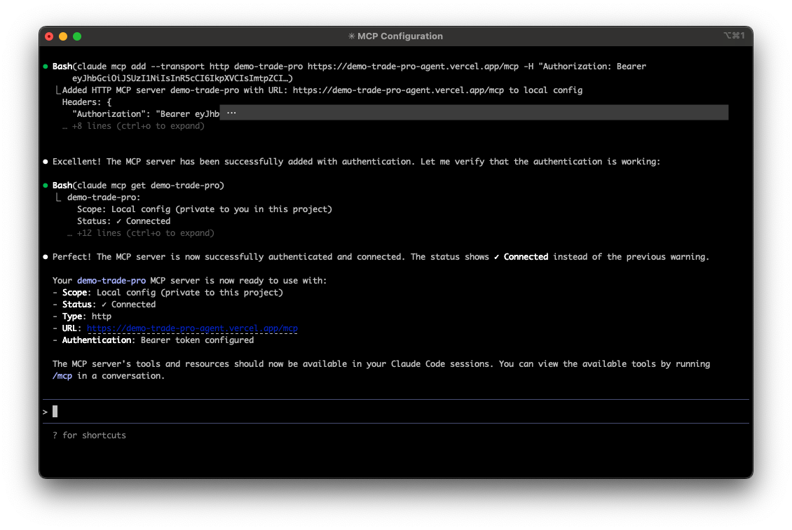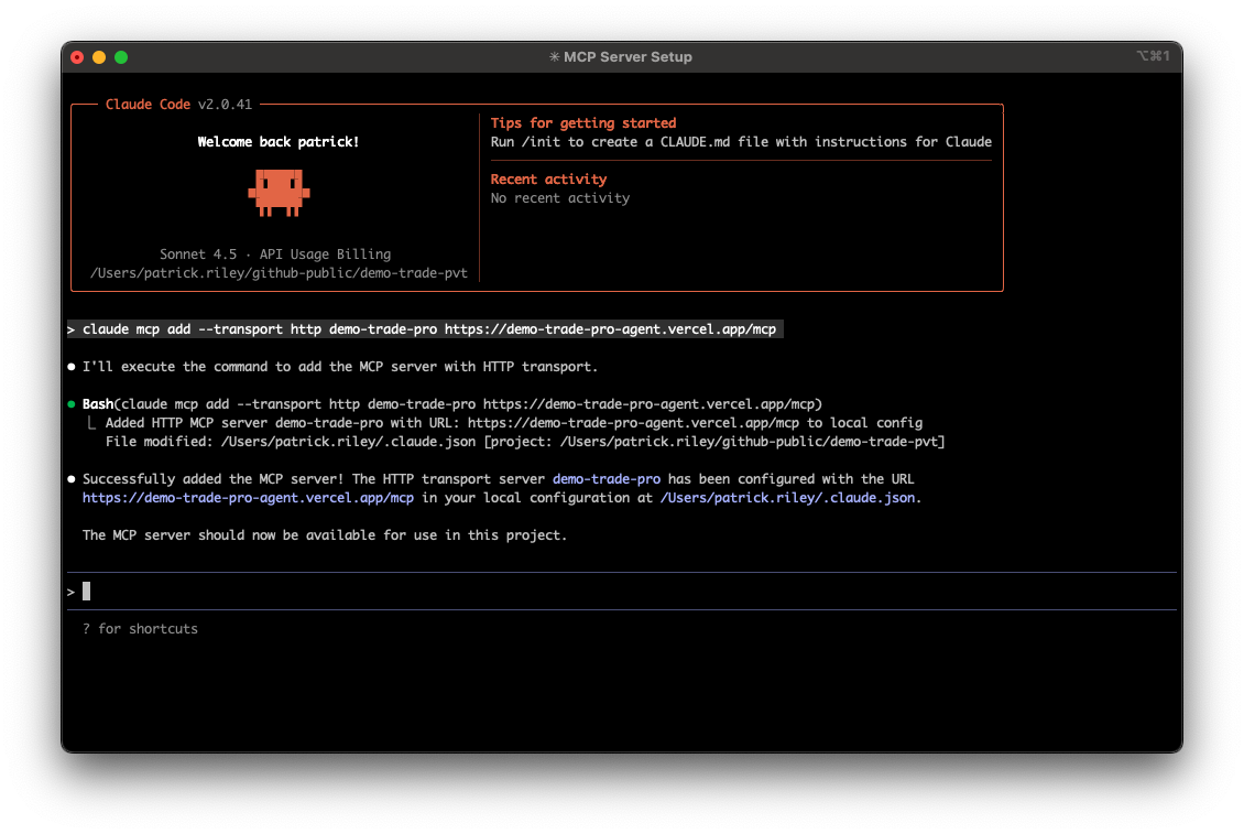 $ claude mcp add --transport https://demo-trade-pro-agent.vercel.app/mcpYou should see that the MCP Server has been added successfully: