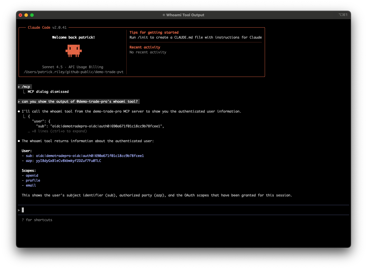 Note: you haven't yet authorized any of the tools to be used by Claude Code at this point and you'll later be prompted to do so when you first try to use a protected tool. I prefer to authorize using my MCP Inspector access token for simplicity up front using the -H "Authorization: Bearer <token>" arg with this command, but you can also authorize using the standard OAuth flow if you prefer. There is some additional documentation about this in the Claude Authenticate with Remote MCP Servers documentation.