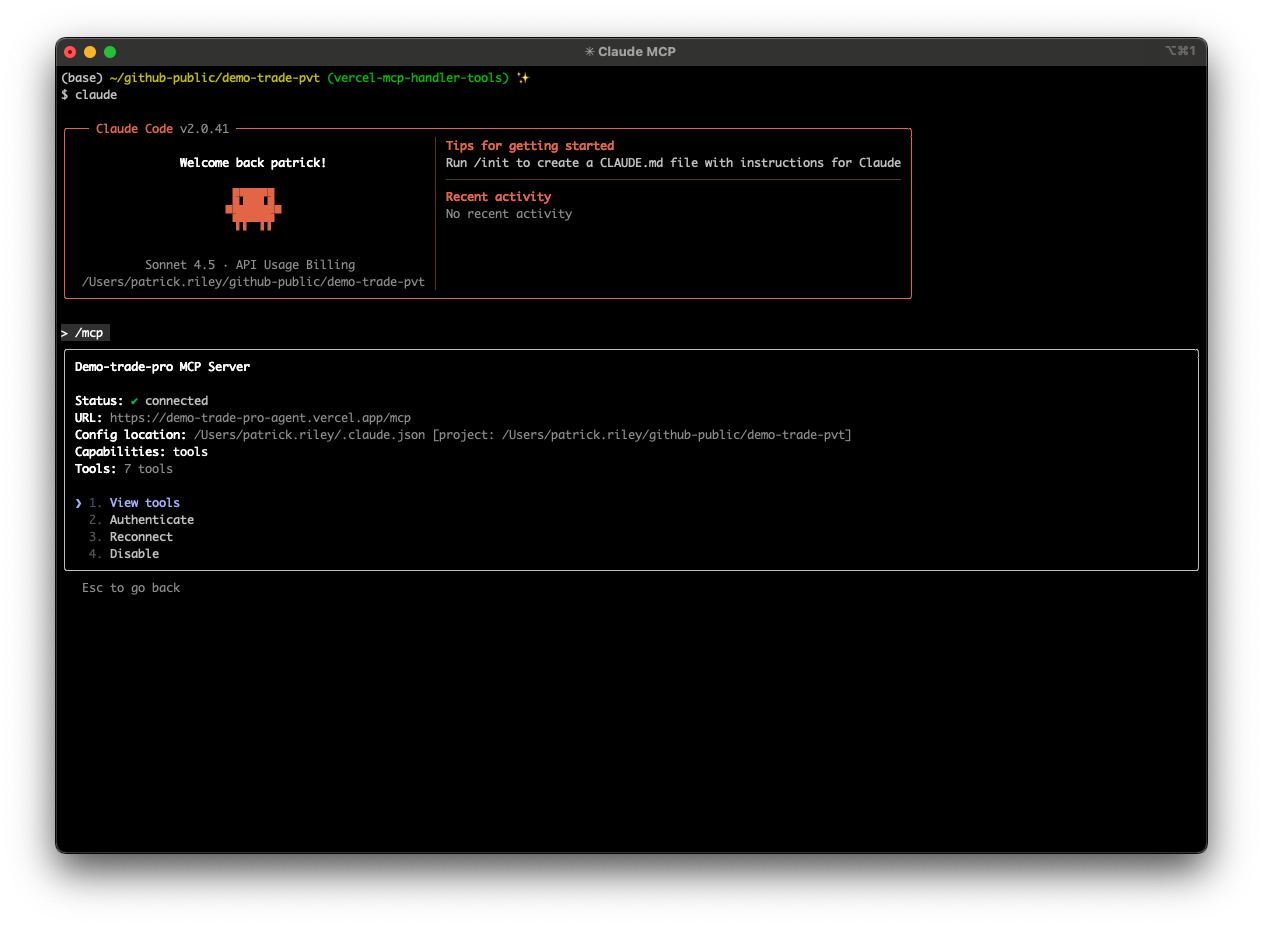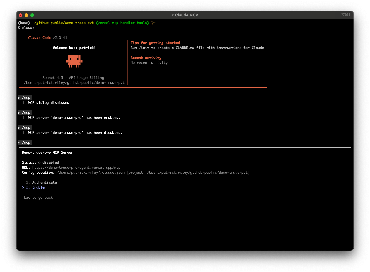 Next, let's make sure the MCP Server is enabled and ready to be accessed. Run /mcp and ensure you have the DemoTradePro MCP server enabled: